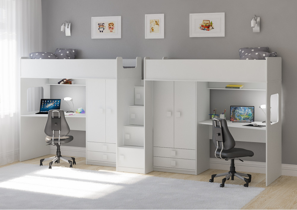 Под спальным местом для каждого ребенка располагается рабочее место с встроенным столом.