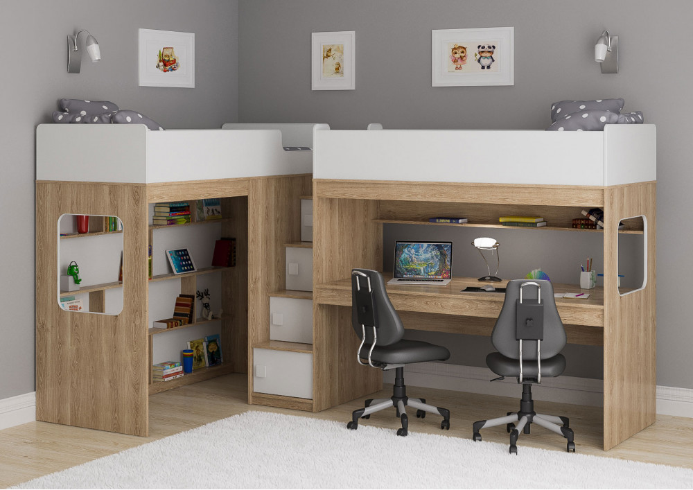 Две кровати, огромный стол, игровая зона – одна лестница. Идеальный вариант для двоих детей!